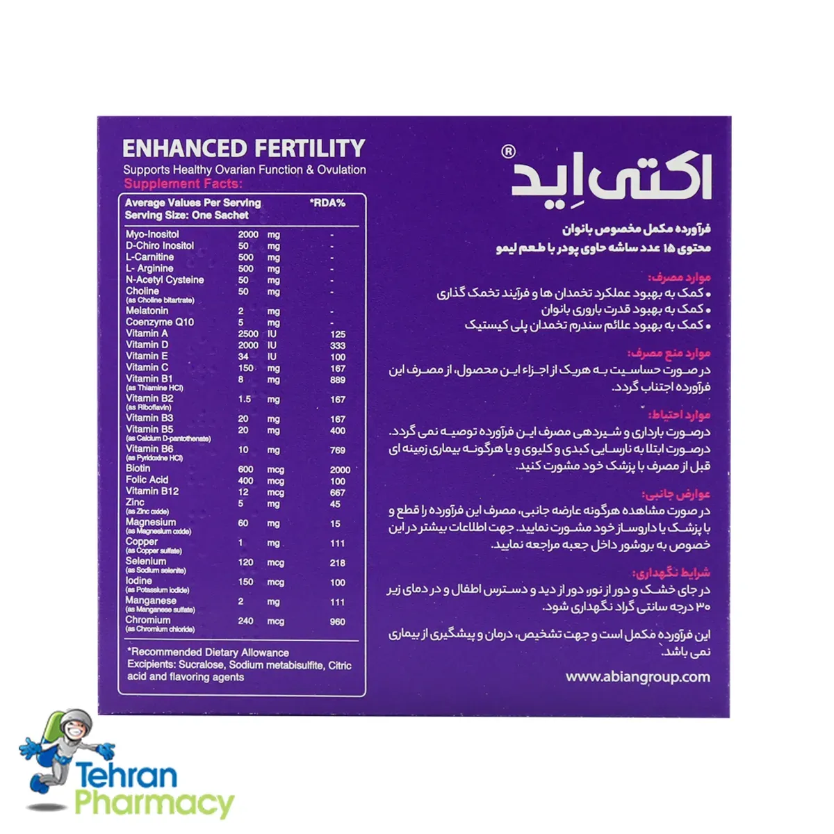 شما میتوانید ساشه اکتی اید بانوان ابیان دارو را بهصورت آنلاین از داروخانه تهران با تضمین اصالت کالا، ارسال سریع و مشاوره رایگان خریداری کنید. در صورت نیاز به مشاوره درباره انتخاب مکمل مناسب برای افزایش باروری یا تنظیم سیکل قاعدگی، با کارشناسان داروخانه تهران تماس بگیرید. -