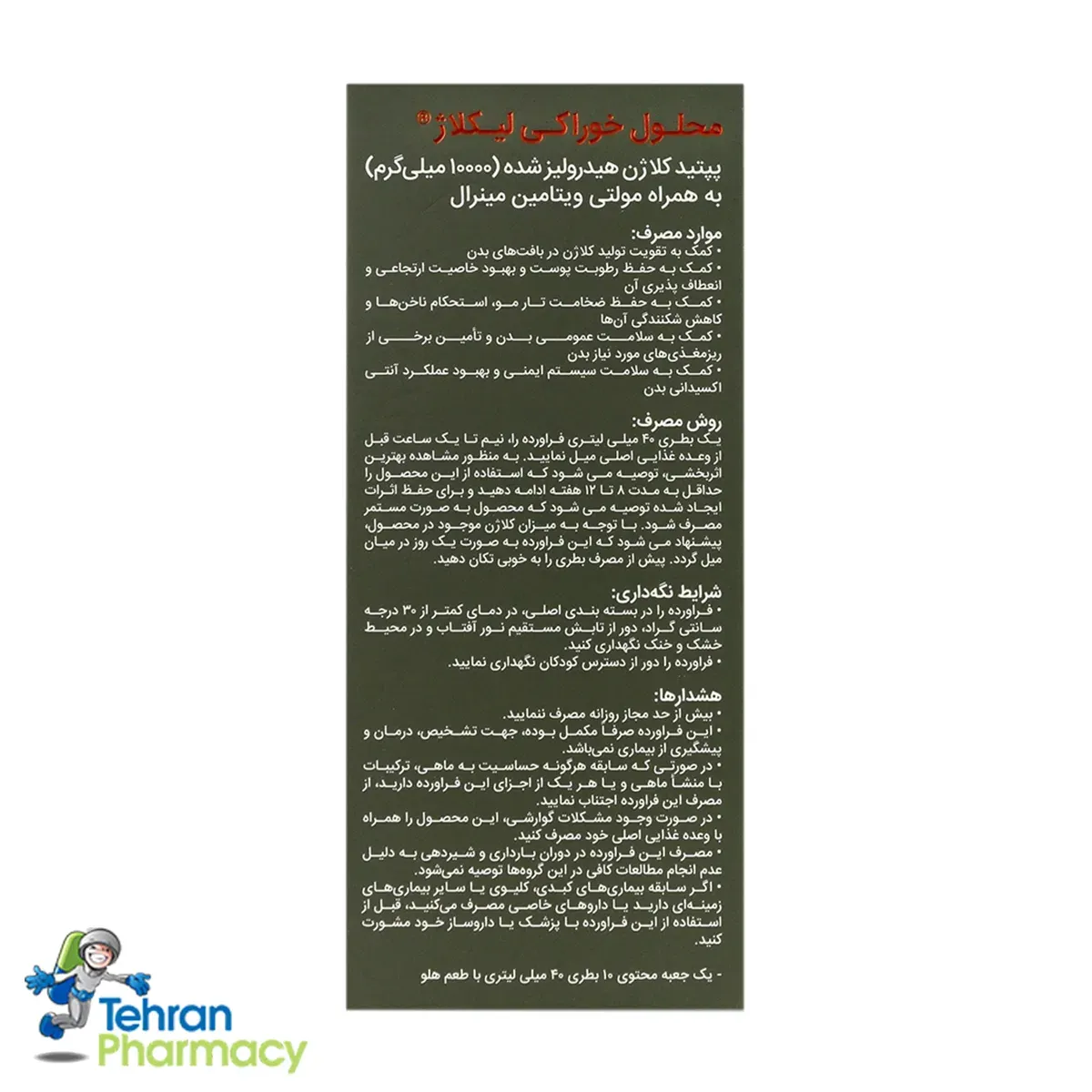 لیکلاژ یک مکمل خوراکی حاوی ۱۰ گرم کلاژن دریایی هیدرولیز شده، هیالورونیک اسید و ویتامینهای ضروری است که برای جوانسازی پوست، تقویت مو و ناخن و بهبود سلامت مفاصل استفاده میشود.