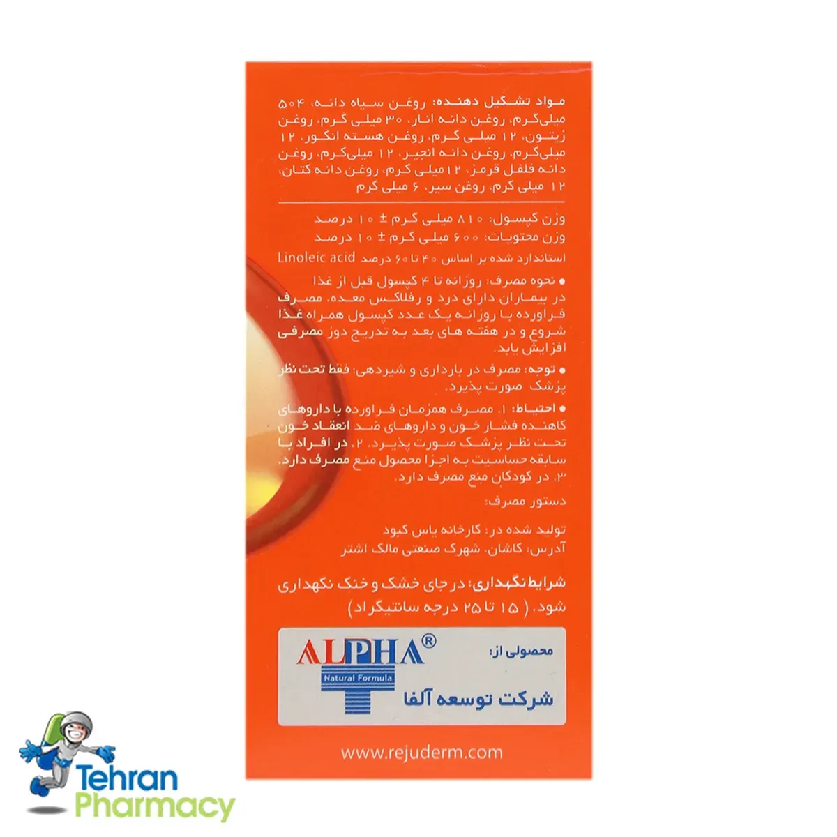 این محصول حاوی روغن سیاهدانه، روغن دانه انار، روغن زیتون، روغن هسته انگور، روغن دانه کتان، روغن سیر و عصارههای گیاهی دیگر است که هر کدام نقش حمایتی در سلامت بدن دارند.